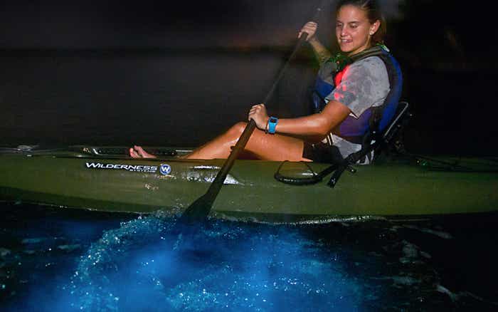 Kajakfahren macht Spaß, sicher, aber diese Erfahrung wird Sie umhauen. Saisonal, nach Einbruch der Dunkelheit, leuchten das Wasser des Indian River und der Mosquito Lagoon buchstäblich, wenn Ihr Ruder auf das blaue Wasser der Gatorade trifft. Das liegt daran, dass kleine Organismen namens Dinoflagellaten aufleuchten., Es heißt Biolumineszenz und sie zu sehen ist noch magischer als es klingt.