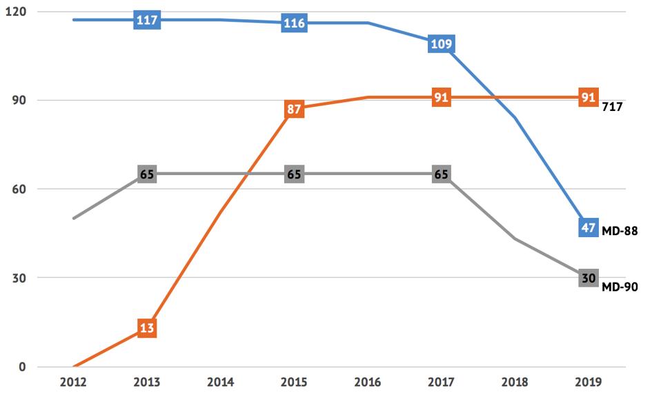 Delta Air Lines 717, MD-88 és MD-90 in-service fleet at year end