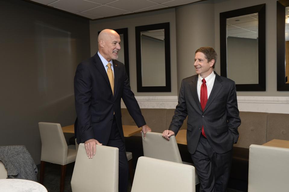 – CHICAGO, IL – 10 NOVEMBER: Johannes Paxson, General Manager och Michael Reinsdorf av Chicago Bulls … chattar innan NBA All-Star 2020 Tillkännagivande den 10 November 2017 på United Center i Chicago, Illinois. Anmärkning till användare: Användaren erkänner uttryckligen och samtycker till att användaren samtycker till villkoren i Getty Images Licensavtal genom att ladda ner och eller använda detta fotografi., Obligatoriska Meddelande om Upphovsrätt: Upphovsrätten 2017 NBAE (Foto av David Dow/NBAE via Getty Images)